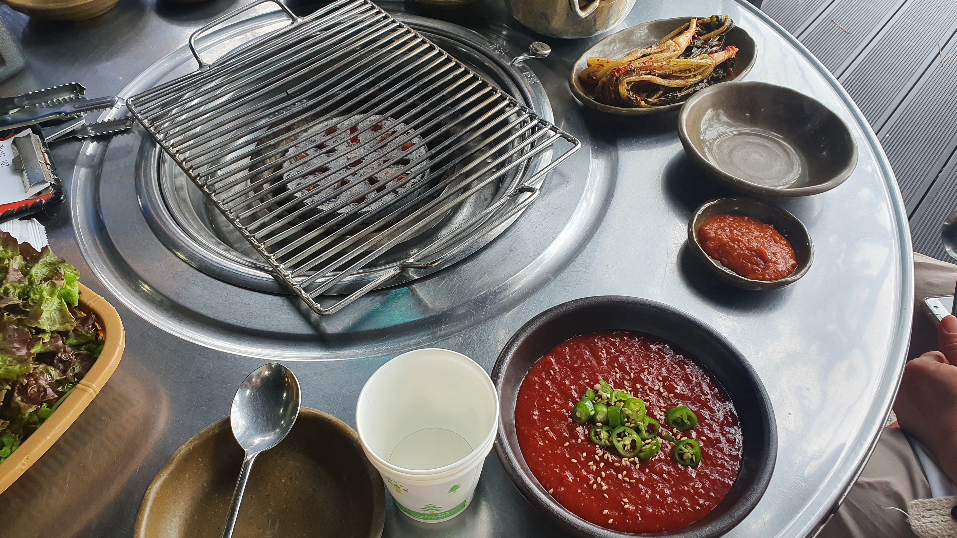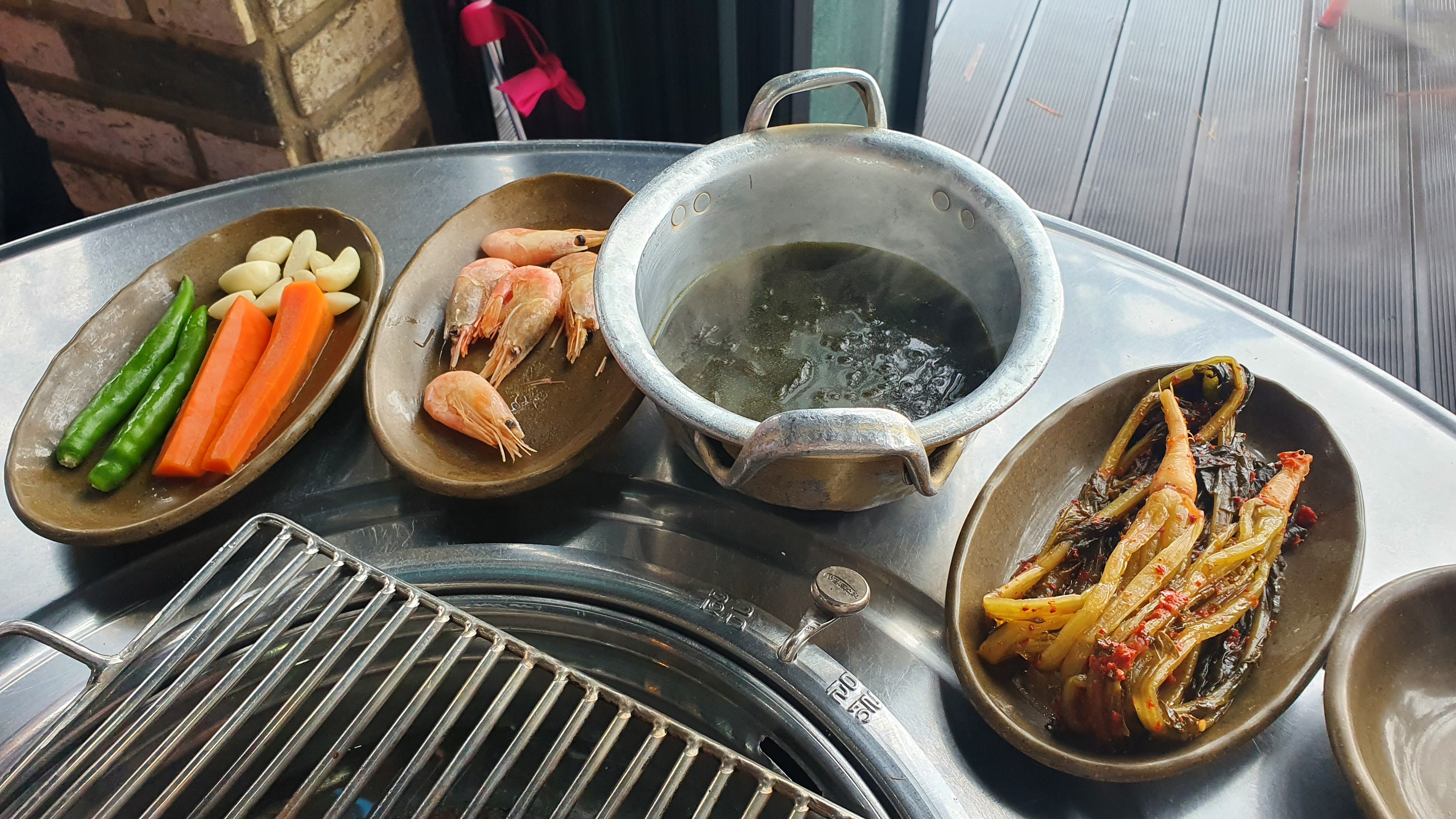 연탄불에 나오는 반찬들 저 고추장 같이 생긴 것은 장어구이에 찍어먹는 소스라고 하네요. 여기는 생강을 주지 않아서 신기했습니다.